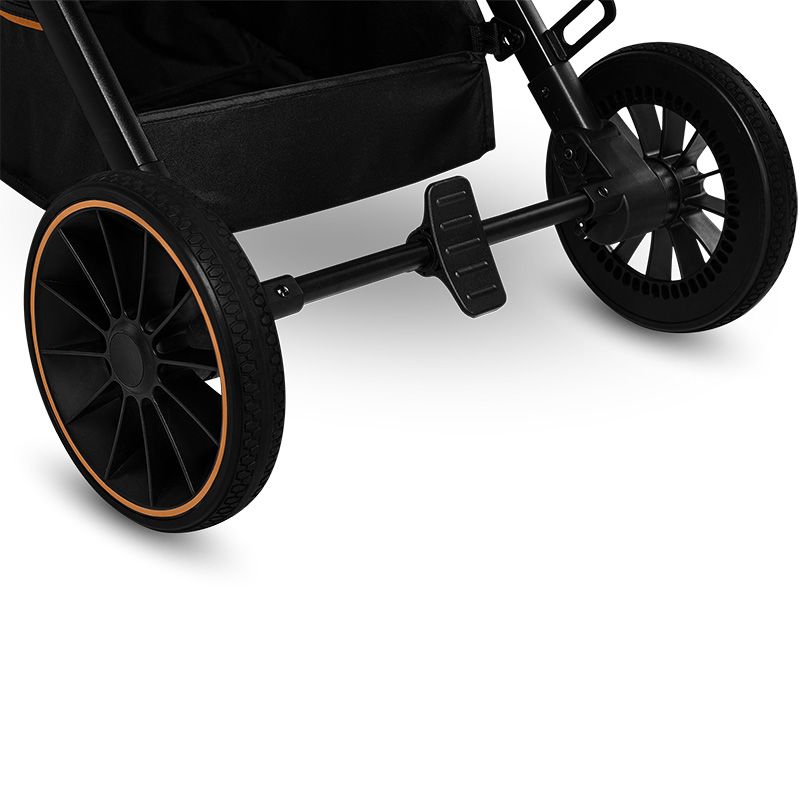 La poussette Lionelo Riya est munie de roues en polyuréthane équipées d'amortisseurs qui vous permettent de vous balader aussi bien en ville qu'à la campagne.